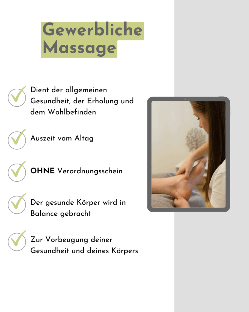 Manchmal braucht es einfach eine Pause, um wieder ganz bei sich selbst anzukommen. Die gewerbliche Massage bietet dir genau das: eine Auszeit für deinen Körper, die ihm hilft, Verspannungen zu lösen, neue Energie zu tanken und in Balance zu kommen.